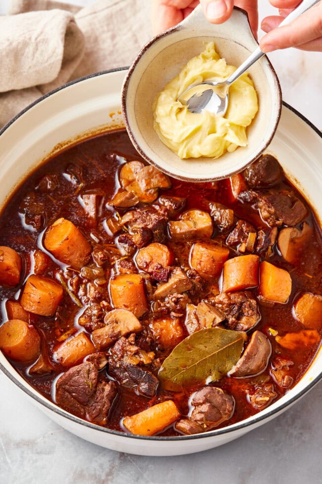 - Slowly stir the butter mixture into the stew until the desired thickness in reachedโI like to add it all!