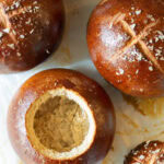 Each dough ball is brushed with egg before baking to create a dark glossy crust, then kissed with salt flakes on top. You can cut out a core to turn the round loaves into bowls, then snack on the salty-sweet core!