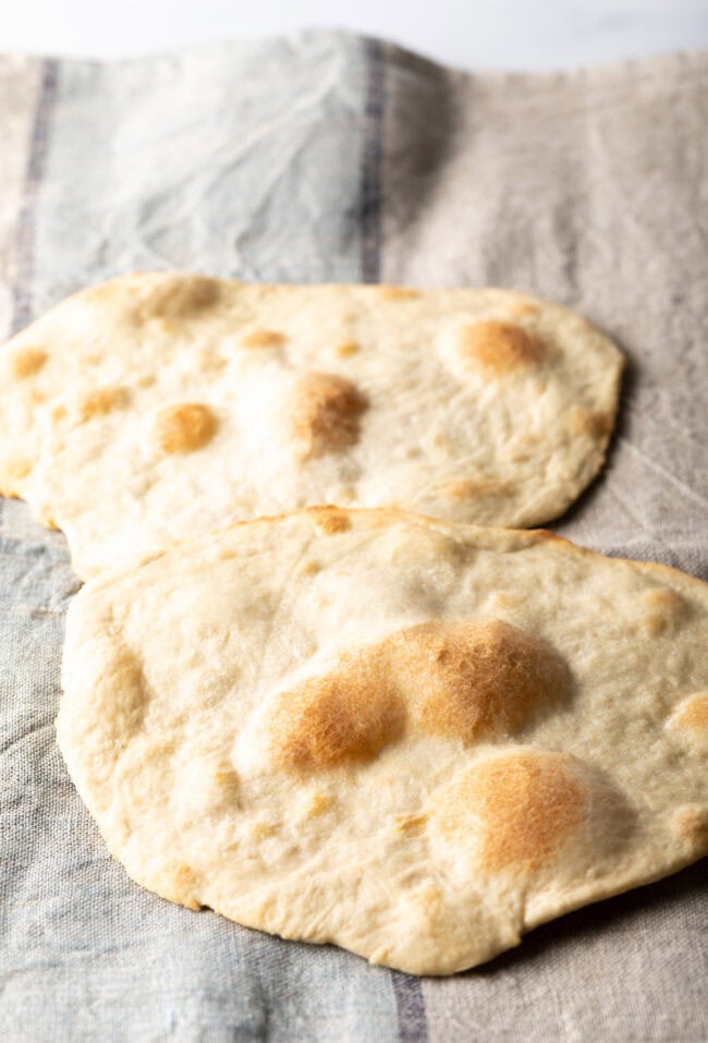 For a slightly softer bread, I suggest baking for only up to 8 minutes. Then it’s great to enjoy like pita bread with Mediterranean Fattoush Salad, Beef Kafta Kebab, and Zesty Greek Chicken. Serve as a rustic naan-like flatbread with saucy dishes like Lamb or Paneer Tikka Masala, Butter Chicken, and Chicken Madras Curry.