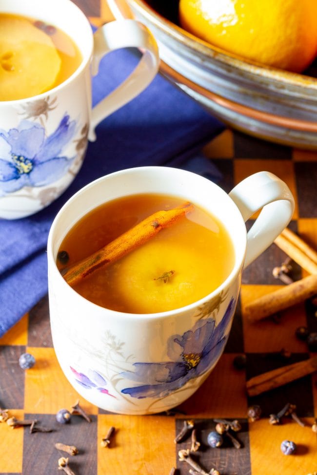 Ourย sweet and spicy mulled ciderย wassail made with apple cider, orange juice, hibiscus tea, cinnamon, ginger, cloves, juniper berries, and fresh fruit.