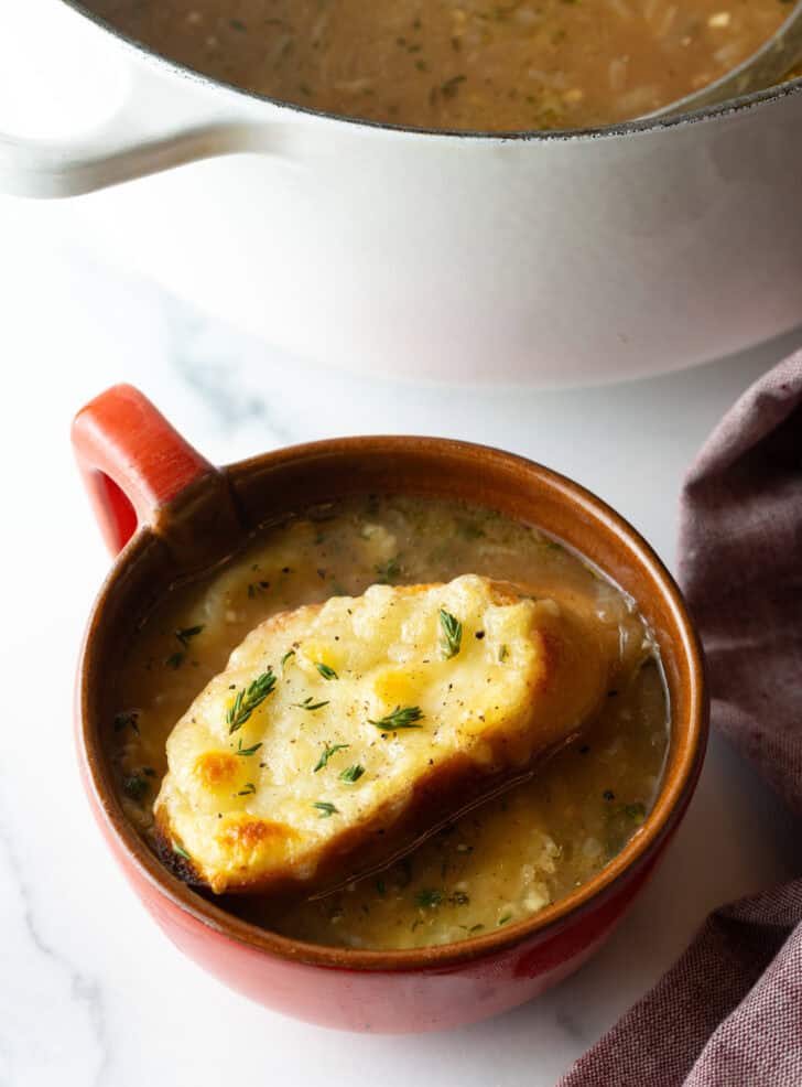 - Ladle the hot soup into soup bowls. Use a thin metal spatula to lift the cheese toast with the surrounding melted cheese and place them in the soup bowls. Garnish with extra fresh thyme leaves if desired.