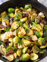 Braised Brussels Sprouts with Sun-Dried Tomatoes, Artichokes, and Olives