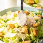 And, of course, this is the BEST homemade Caesar salad dressing! Fill a large bowl with chopped fresh Romaine lettuce and top with shaved Parmesan cheese, crunchy croutons, and plenty of dressing.