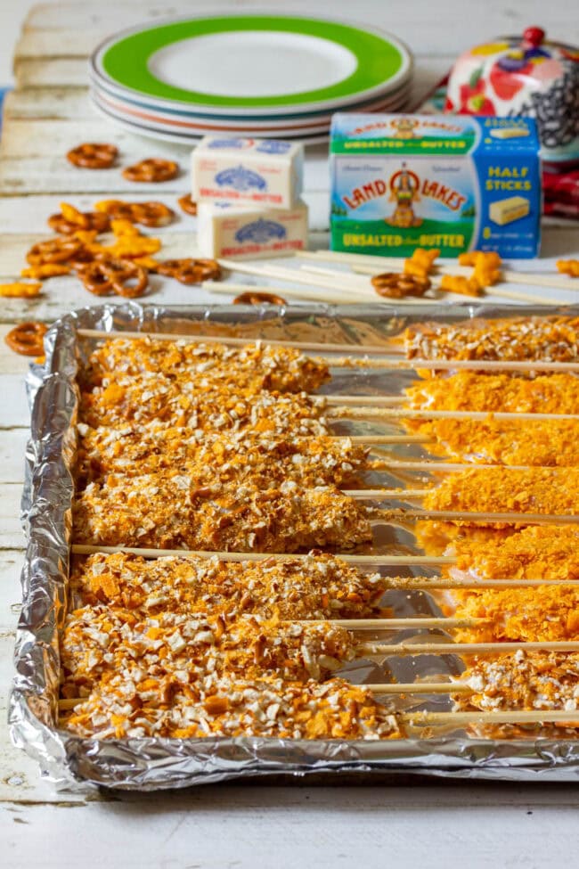 We recently created these Cheesy Pretzel Chicken on a Stick with Honey Mustard Sauce using cheese crackers, pretzels, and sweet cream Land O Lakesยฎ Butter for a crunchy savory crust.
