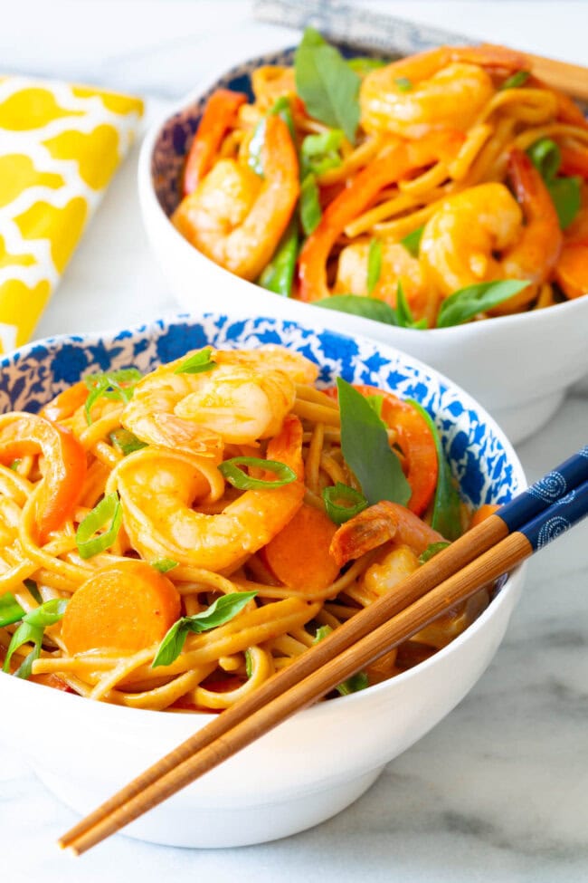 One Pot Thai Shrimp Curry Noodle Bowls โ A simple one-pot meal with HUGE flavor. Fresh shrimp, silky red curry sauce, and fresh herbs and vegetables. You will love this!