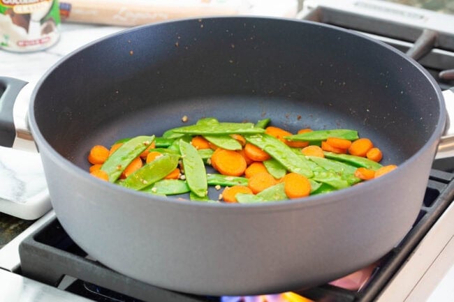 - Place a large deep skillet over medium heat. Add the sesame oil. Once the oil is hot add the shrimp and garlic. Sprinkle with salt and pepper. Sear the shrimp for 2 minutes, then remove them from the pan and place in a holding dish. Next add the snow peas and carrots to the skillet. Sear for 3 minutes, then remove. Finally add the red peppers to the skillet. Sear for 2 minutes, then remove.