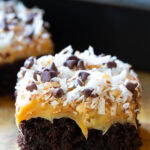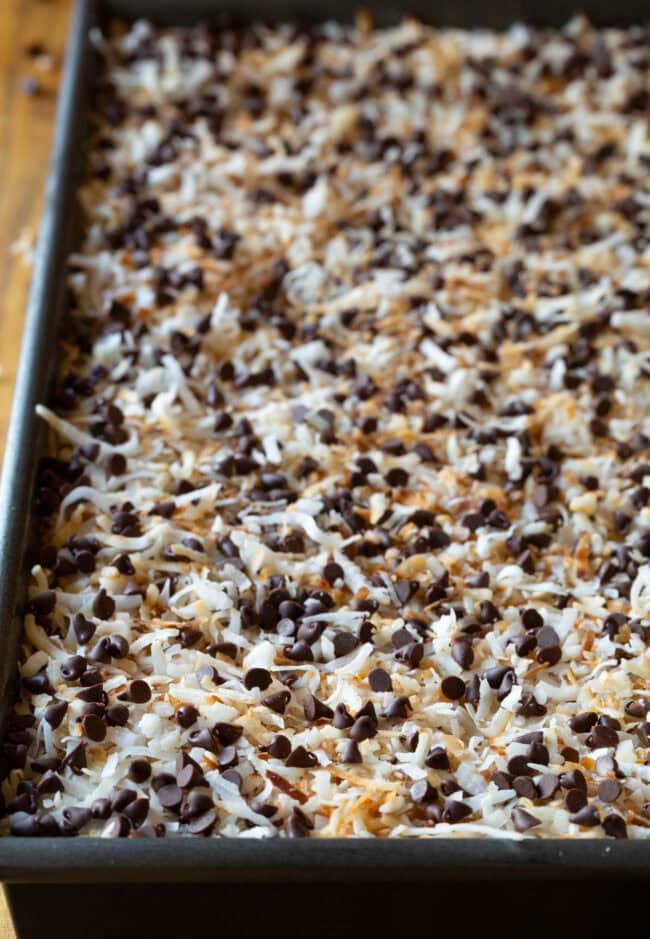 - Pour the caramel mixture over the entire cake and top it off with the toasted coconut and mini chocolate chips!