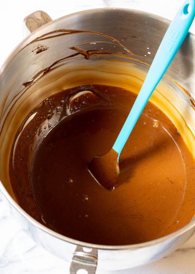 - Turn the mixer on low and beat the chocolate until completely smooth. Raise the mixer speed to medium if needed. Then cool the chocolate ganache in the refrigerator until very cold, at least one hour.