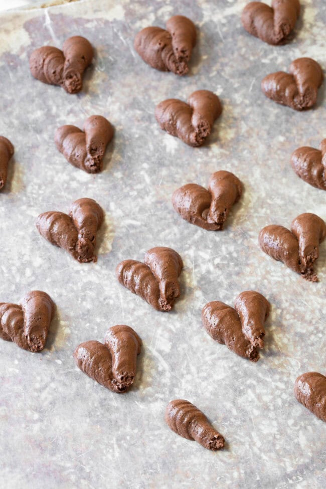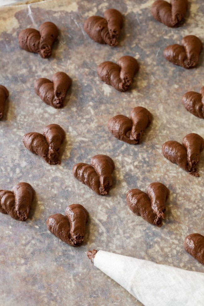 Usually I pipe little 1-inch mounds of ganache to make round truffles. Yet today, I thought it would be fun to make heart-shaped truffles for Valentineโs Day.