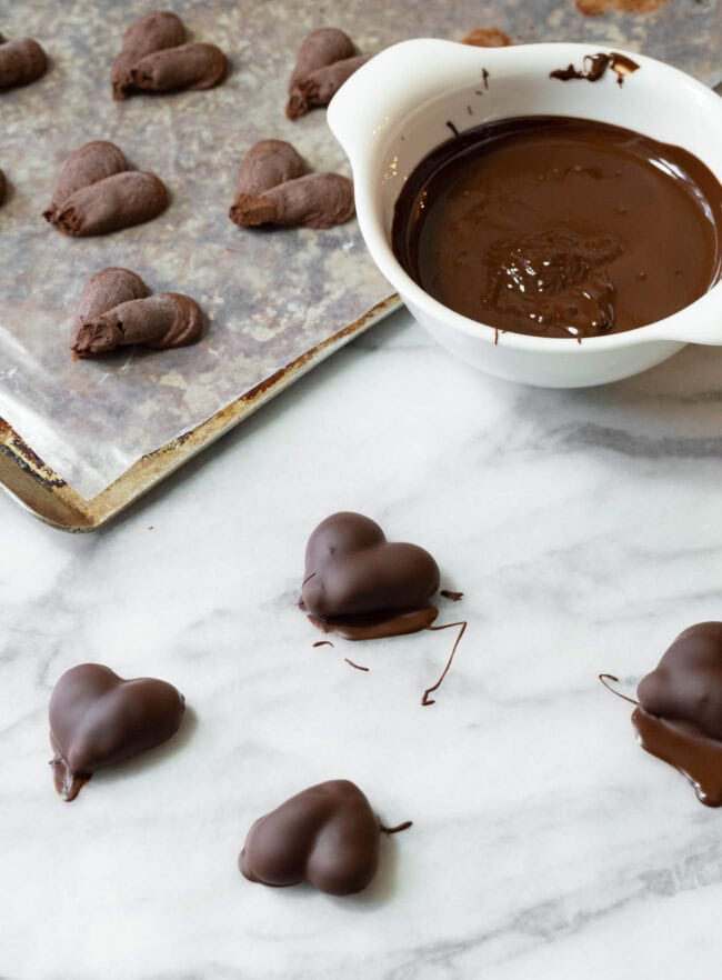 Line a couple of baking sheets with parchment or wax paper. Then pipe the whipped ganache into 1-inch rounds on the wax paper. For hearts: Pipe a smaller mound, then drag it forward. Repeat to make a second hump next to it and drag the ganache down to a rough point. Don’t worry if it looks messy. The chocolate coating smooths out imperfections. Freeze the ganache mounds on the baking sheets until rock-hard, at least one hour.