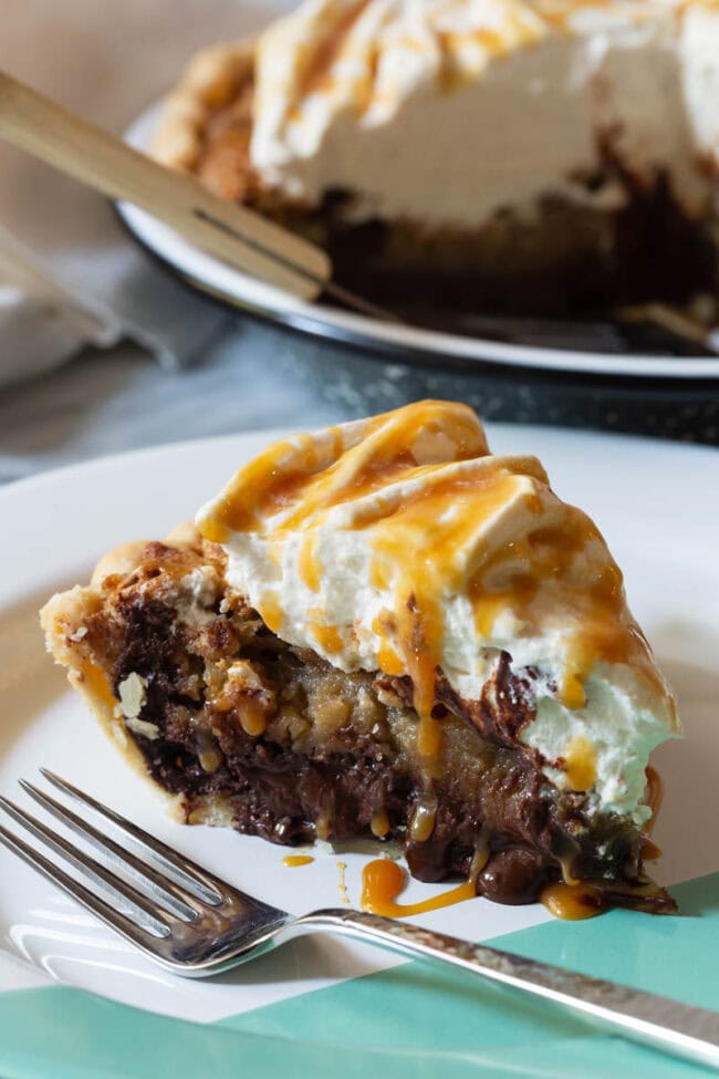 - When ready to serve the pie, whip the heavy cream on high until firm peaks form. Whip in the caramel sauce. Scoop the whipped cream onto the top of the pie and smooth out neatly. Drizzle the top of the pie with extra salted caramel sauce. Cut and serve.