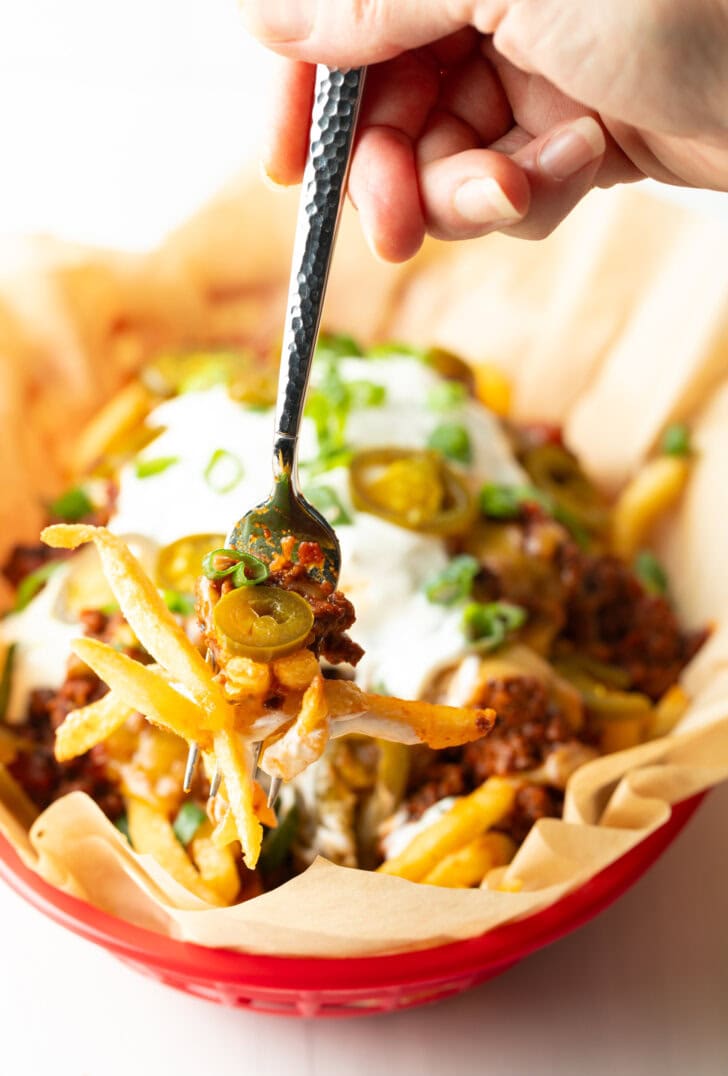 - Once the fries are golden and crispy, pile them on a large serving platter. Ladle hot chili over the top of the fries, then follow with a heavy sprinkling of cheddar cheese, several dollops of sour cream, a sprinkling of scallions, and pickled jalapeรฑos. Serve immediately.