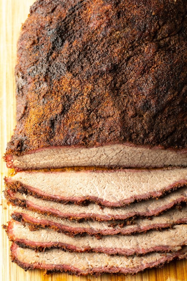 You want a firm and crisp bark (more on this below), a pronounced pink smoke ring underneath the bark, an even smoky flavor throughout the meat, and a good stretch in the brisket slices.
