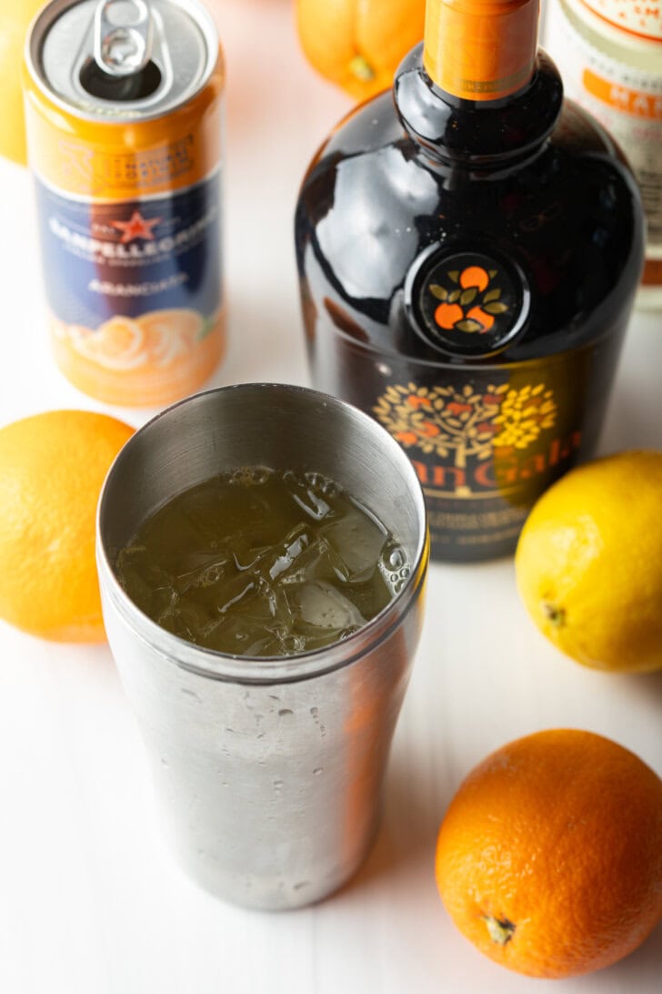 - Set out a cocktail shaker and fill it with ice. Combine the freshly squeezed orange juice, San Pellegrino orange soda, orange vodka, orange liqueur, and a tiny splash of fresh lemon juice. Stir vigorously.