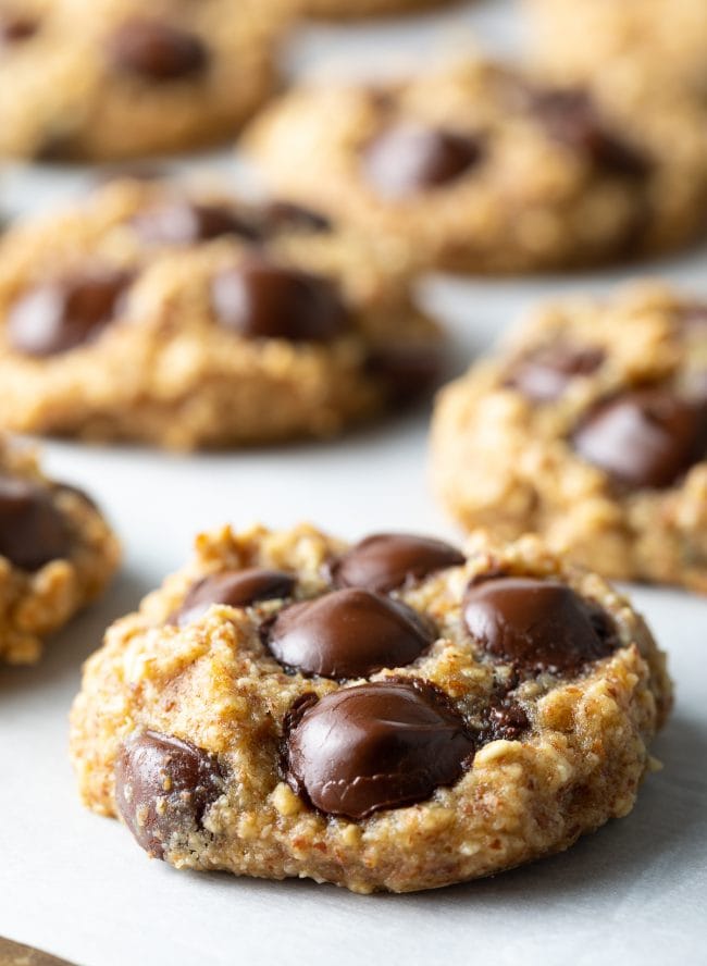These gluten-free Skinny Banana Oatmeal Cookies taste just like banana bread, and are loaded with brown sugar and chocolate chips for a perfectly sweet and healthy(ish) treat!