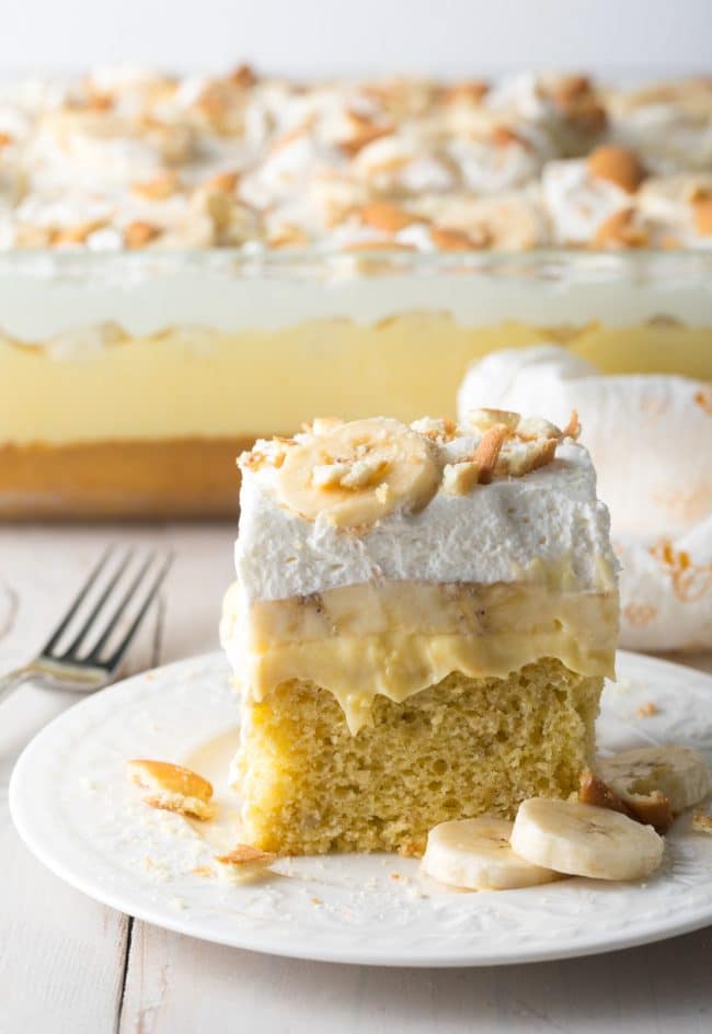 This ultra moist Layered Banana Pudding Cake recipe is topped with layers of creamy pudding, fresh bananas, whipped cream, and vanilla wafers. It’s easy to make, and packed with Southern charm straight out of the pan!