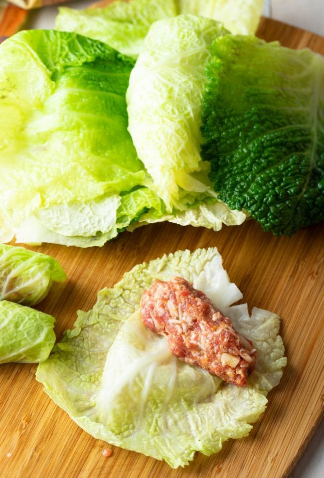 - Working one at a time, scoop ยผ cup of the meat filling and place it on a cabbage leaf.