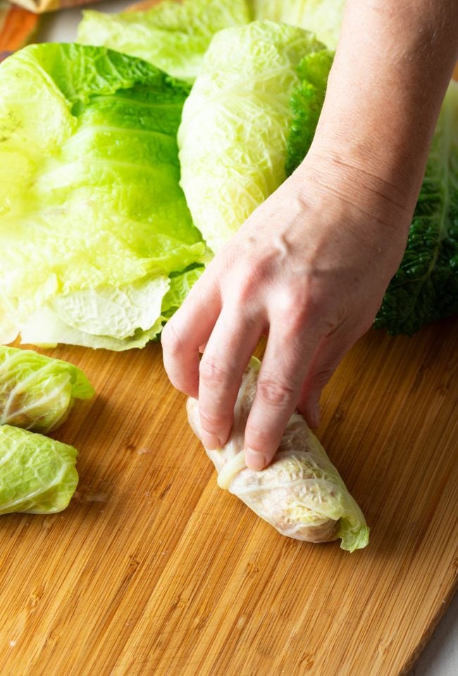 - One at a time, scoop ยผ cup meat filling and place it on a cabbage leaf. Roll the cabbage leaf like a burrito, tucking the sides inward to enclose the filling. Place in the slow cooker, seam-side down. Repeat with the remaining leaves and meat filling. Stack the cabbage rolls if needed.