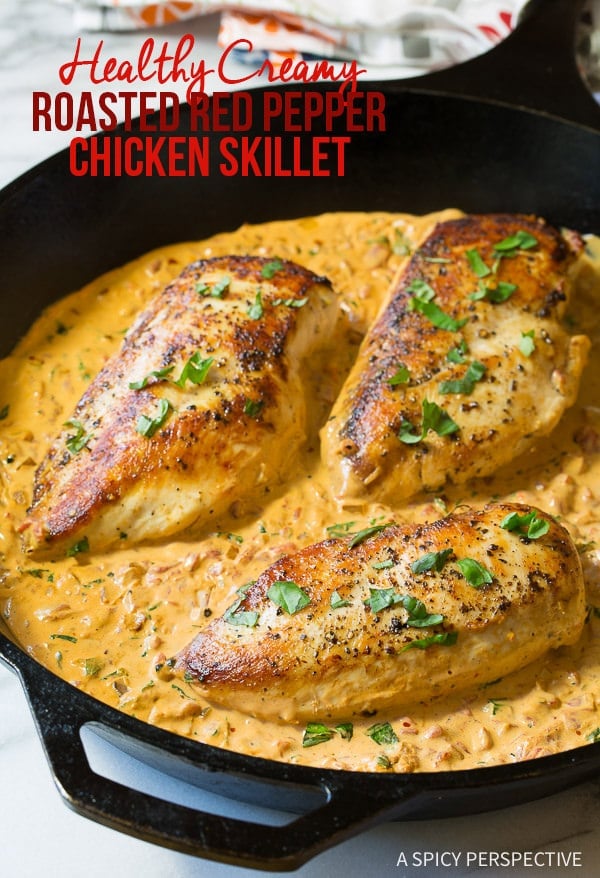 So here it is, folks, the quickie meal that has become a family favorite in my house: Creamy Roasted Red Pepper Skillet Chicken.