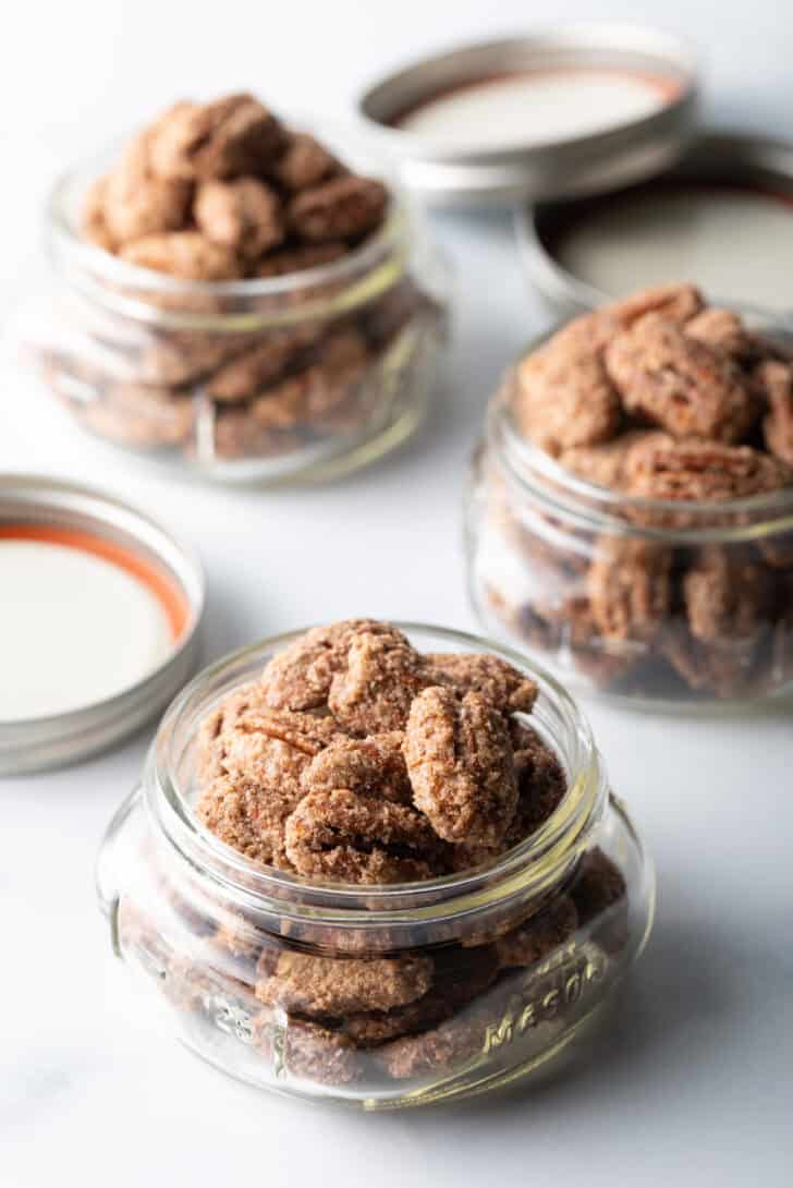 Once cooled, move the cinnamon sugar pecans to an airtight container and store them for up to 4 weeks. I love to package them up in cute little jars to give as holiday gifts!