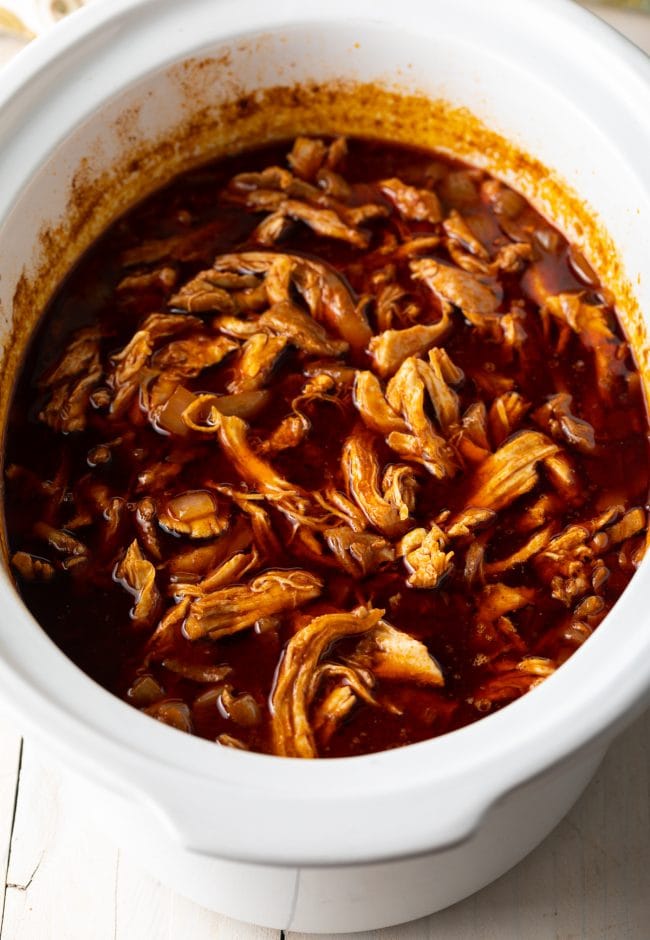 - Once the chicken is fork-tender, pull the pieces out of the slow cooker with tongs and place on a cutting board. Use forks to shred the chicken into bite-sized pieces.