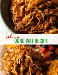 There are many variations of Doro Wat (Doro Wot). Some use whole bone-in chicken pieces, others cook boneless chicken down to shreds. We prefer making shredded Doro Wat, because the โbarbecue beefโ consistency makes it easier to scoop up with traditional Injera bread. So this version is an Ethiopian shredded chicken stew with all of the authentic flavors of classic doro wat, just a little easier to eat!