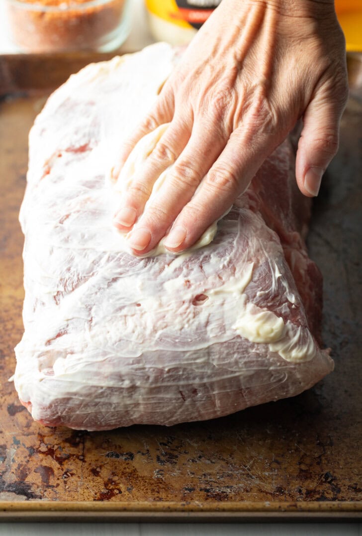 Rub 2 tablespoons of mayonnaise over all sides of the pork butt to act as the base of the dry rub crust.